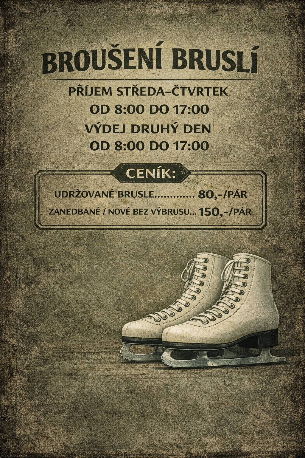 V zimním období poskytujeme službu broušení bruslí. Příjem i výdej probíhá v naší prodejně v Lišově. Pokud je potřeba nabrousit brusle v jiný než uvedený den, neváhejte nás kontaktovat na tel.: 724 531 195.